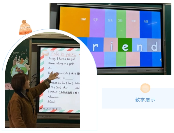 课堂伊始,胡老师以动画视频“pen pal”导入,既铺垫了必要的文化背景知识,也引导学生逐步走进本课的主题“hobbies”。 教学中,胡老师运用了问题引领、视听结合、情感体验、思维拓展等方式方法,为学生搭建起语言框架,让学生在听、说、读、看、写中,在不断的思考、探索中促进核心素养的逐步提升。