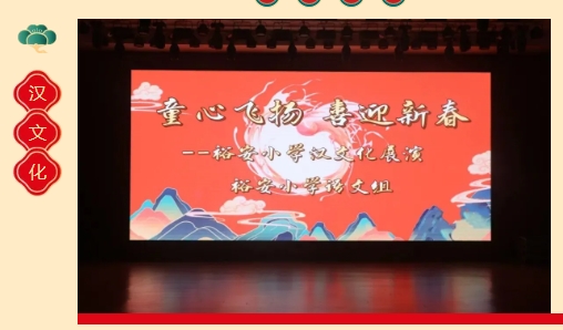 12月31日,裕安小学礼堂内诗声琅琅、汉韵流淌,“童心飞扬 喜迎新春”汉文化展演活动在这里精彩上演。由学校语文组精心策划、三、四年级学生倾情演绎的这场文化盛宴,不仅展示了学校在汉文化教育方面的深厚积淀,更呈现了以文化人、以文育人的丰硕教学成果。