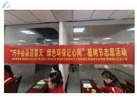 本次 “巧手拓染迎春天绿色环保记心间” 植树节志愿活动由城镇团委、通桥社区党总支部、裕安小支部、通桥社区新时代文明实践站、樊通桥社区妇联、樊通桥社区团支部联合开展。