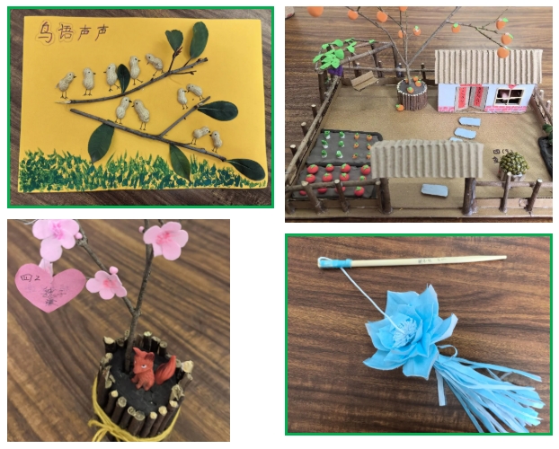 一件件构思巧妙、造型各异的绿色环保作品悄然诞生:有用废纸做成的参天大树,有用瓶盖拼出的环保标识…… 孩子们在动手实践中深刻体会到,节约资源、循环利用本身就是最好的环保。